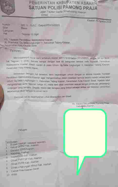 Pasalnya, SP3 yang bernomor 300.1/1495/Satpol PP/VIII/2025 tertanggal 5 Agustus 2025 yang ditandatangani Plt Kasat Pol PP Kabupaten Asahan tersebut tidak memiliki batas tenggat waktu bagi pengelola yayasan untuk segera melakukan pembongkaran. Surat ini terkesan tidak lazim seperti biasanya surat peringatan terakhir.