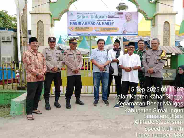 Simalungun, NusaNEWSTV.com – Dalam semangat memperkuat persatuan Indonesia dan memelihara keharmonisan antarumat beragama, Kepolisian Resor Simalungun melalui Sektor (Polsek) Bosar Maligas berhasil mengamankan kegiatan Safari Dakwah memperingati Maulid Nabi Muhammad SAW 12 Rabiul Awal 1447 H yang dihadiri 500 jamaah. Acara yang berlangsung di Masjid Jami Kelurahan Bosar Maligas pada Jumat (5/9/2025) mulai pukul 08.30 WIB hingga selesai ini menghadirkan Habib Ahmad Al Habsyi sebagai penceramah utama dan dihadiri berbagai elemen masyarakat dari beragam latar belakang.