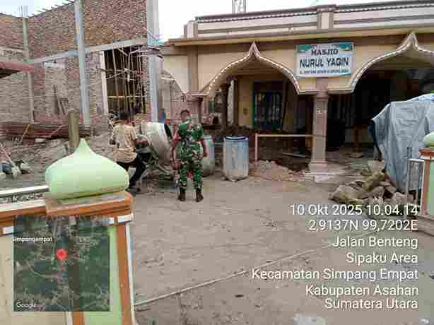 Babinsa bersama warga setempat melaksanakan gotong royong (Gotroy) pembangunan Masjid Nurul Yaqin di Dusun III, Desa Sipaku Area, Kecamatan Simpang Empat, Kabupaten Asahan, Sumatera Utara (Sumut). Kegiatan gotong royong tersebut merupakan wujud nyata kemanunggalan TNI dengan rakyat serta peran Babinsa sebagai ujung tombak satuan teritorial dalam mendukung pembangunan di desa.