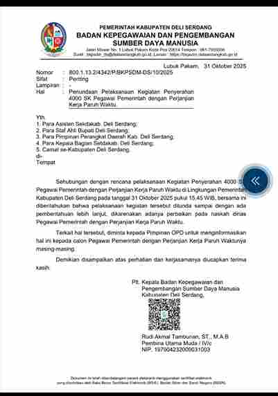 Plt. Badan Kepegawaian Daerah dan Pengembangan Sumber Daya Manusia Kabupaten Deli Serdang Rudi Akmal Tambunan, ST., M.A.B dikonfirmasi melalui surat resmi yang tercantum nomor 800.1.13.2/4342/P/BKPSDM-DS/10/2025 menyebutkan,”memastikan pemerintah tetap berkomitmen menyelesaikan penyerahan SK secara transparan dan sesuai prosedur. (Brenta Barus)