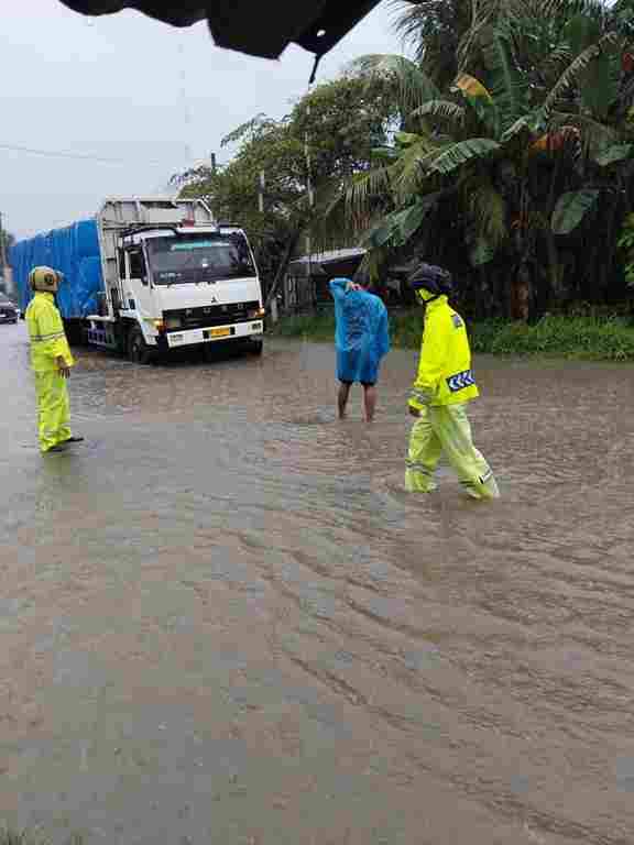 Dalam pelaksanaan tugas pengaturan arus lalin curah hujan tanpa henti Pos lantas bersama Bhabinktibmas tetap sigap mengarahkan berkendara dijalan yang aman, walaupun genangan air memasuki badan jalan tinggi 25 cm.