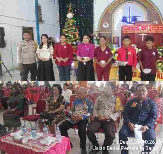 Simalungun, JournalisNEWS.com – Kehangatan dan kegembiraan menyelimuti perayaan Natal siswa SMP Swasta Yayasan Kerasaan yang digelar di Gereja GPDI Jemaat Kurios, Kampung Baru Lingkungan II, Kelurahan Kerasaan I, Kecamatan Pematang Bandar, Selasa pagi (16/12/2025). Kegiatan yang dimulai pukul 09.00 WIB ini berjalan khidmat dengan dihadiri langsung oleh Bhabinkamtibmas Polsek Perdagangan.